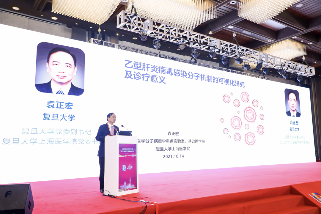 復(fù)旦大學(xué)黨委副書記、復(fù)旦大學(xué)上海醫(yī)學(xué)院黨委書記袁正宏教授作了題為《乙型肝炎病毒感染分子機制的可視化研究及診療意義》的專題報告。報告介紹了研究團隊利用基于 bDNA 的熒光原位雜交結(jié)合免疫熒光技術(shù)及 CRISPR-Tag 活細(xì)胞實時熒光失蹤技術(shù),系統(tǒng)性地建立了在體外細(xì)胞和組織系統(tǒng)進行原位雜交加熒光、顯色檢測HBV核酸和蛋白可視化的方法。通過可視化技術(shù),研究團隊在亞細(xì)胞水平直接觀察到HBV病毒組分,揭示了HBV病毒部分關(guān)鍵復(fù)制環(huán)節(jié)的細(xì)節(jié),填補了HBV生活史一些關(guān)鍵環(huán)節(jié)的時空信息。在組織水平觀察到病毒核酸與蛋白的分布特征,反應(yīng)肝臟內(nèi)HBV病毒的生活特征。課題組開發(fā)的可視化技術(shù)可以用來監(jiān)測慢乙肝患者抗病毒治療后病毒蛋白質(zhì)和核酸,尤其 cccDNA 的清除情況,有助于臨床醫(yī)生制訂更好的治療方案,并可為指導(dǎo)開發(fā)新藥物提供幫助。