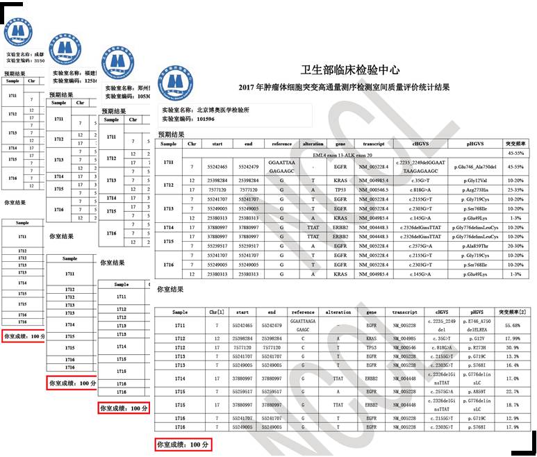 據(jù)臨檢中心統(tǒng)計(jì),本次質(zhì)評(píng)中共有102家實(shí)驗(yàn)室報(bào)名參加,92家實(shí)驗(yàn)室提交結(jié)果。 其中獲得100分實(shí)驗(yàn)室42家,不足參報(bào)總數(shù)的一半。作為國(guó)家衛(wèi)生計(jì)生委首批高通量基因測(cè)序技術(shù)臨床應(yīng)用試點(diǎn)單位,博奧檢驗(yàn)旗下北京、成都、鄭州、福建共計(jì)4家檢驗(yàn)所也積極參與了本次室間質(zhì)評(píng)活動(dòng),且均以滿分100分通過(guò)。