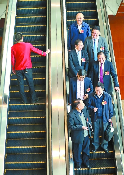 北京國(guó)際飯店,參加全國(guó)政協(xié)十二屆三次會(huì)議的委員們走向小組討論會(huì)場(chǎng),在電梯上相互交流討論。