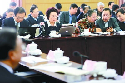 ?7日下午是全國(guó)政協(xié)十二屆三次會(huì)議委員提交提案截止時(shí)間,上午,在醫(yī)藥衛(wèi)生界聯(lián)組討論會(huì)場(chǎng),幾名委員抓緊時(shí)間商議、潤(rùn)色提案。本報(bào)記者 賈同軍攝?