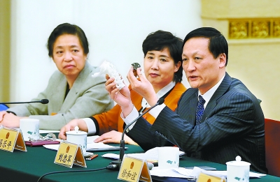 在北京代表團(tuán)向媒體開放審議活動(dòng)中,人大代表、北京大學(xué)第三醫(yī)院骨科主任劉忠軍發(fā)言時(shí)拿出了一截3D打印人體脊椎骨,并以此為例向在場(chǎng)的代表闡述自己的觀點(diǎn),他認(rèn)為,我國(guó)很多自己的科研成果因行政審批難導(dǎo)致走向市場(chǎng)困難,待審批批準(zhǔn)后,國(guó)外同類產(chǎn)品已經(jīng)大規(guī)模上市。本報(bào)記者 戴冰攝?