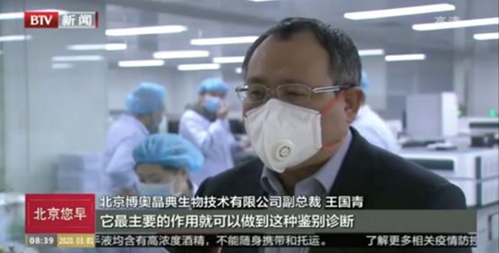 3月1日,BTV北京電視臺《北京您早》早間新聞報(bào)道了博奧為新冠病毒疫情設(shè)計(jì)開發(fā)并獲批的“六項(xiàng)呼吸道病毒核酸檢測試劑盒(恒溫?cái)U(kuò)增芯片法)”。博奧生物旗下北京博奧晶典生物技術(shù)有限公司副總裁、博奧檢驗(yàn)總裁王國青接受采訪并介紹了該試劑盒的獨(dú)特優(yōu)勢及生產(chǎn)情況。