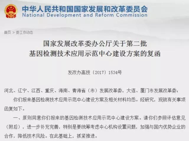 2015年6月,國家發(fā)展改革委發(fā)布了《國家發(fā)展改革委關(guān)于實施新興產(chǎn)業(yè)重大工程包的通知》(發(fā)改高技[2015]1303號),將基因檢測技術(shù)應(yīng)用示范中心納入六大重點工程領(lǐng)域之一——“新型健康技術(shù)惠民工程”,支持擁有核心技術(shù)、創(chuàng)新能力和相關(guān)資質(zhì)的機構(gòu),采取網(wǎng)絡(luò)化布局,建設(shè)示范中心,以開展遺傳病和出生缺陷基因篩查為重點,推動基因檢測等先進健康技術(shù)普及惠民,引領(lǐng)重大創(chuàng)新成果的產(chǎn)業(yè)化。