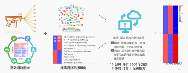 以疾病信號通路為靶標(biāo),以藥物逆轉(zhuǎn)通路為核心,AI驅(qū)動智能組方。當(dāng)把疾病通路靶標(biāo)、藥效通路圖譜輸入計算機,這些平時我們需要通過人去思考去斟酌試錯的組方過程,就變成由實驗數(shù)據(jù)和計算機自動完成,從而形成合適的中藥組方。